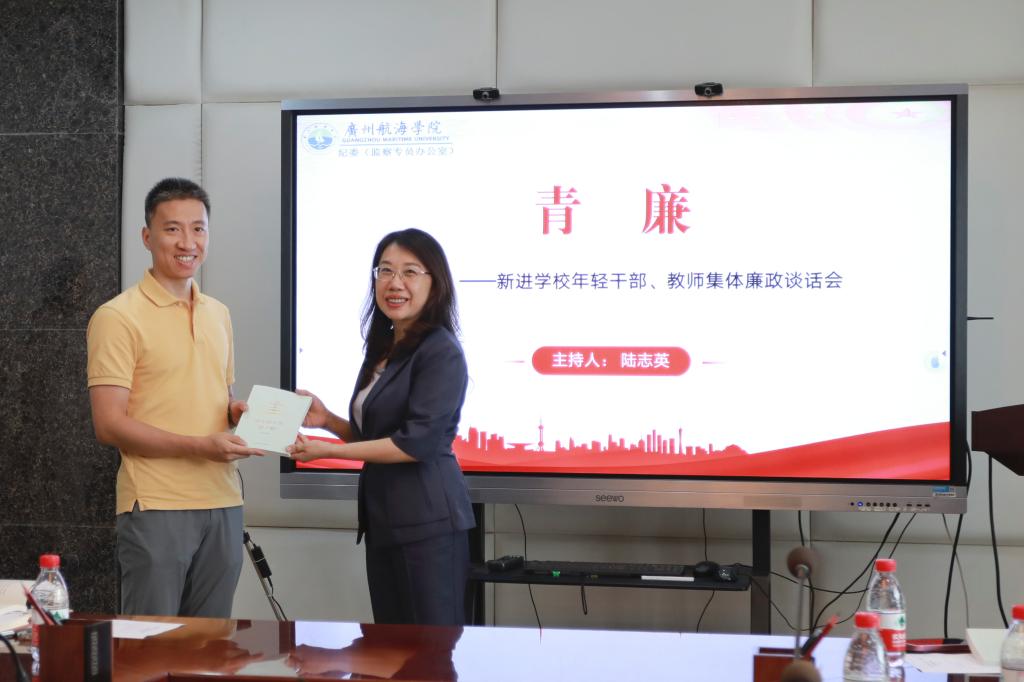 “扬清廉之风,做有为青年;”“五光十色的深渊,莫以贪腐赌未来。”来自学校教学科研、管理服务第一线的13名年轻干部、教师和陆志英、学校组织人事部门负责同志一起,观看了两个生动的纪法小课微视频。陆志英向每位年轻干部、教师赠送了一本廉洁教育读本《给年轻干部提个醒》,倾听大家交流心得感悟。